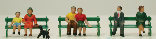 5725 Lot 6 personnages assis avec 3 bancs et 1 chien HO 1/87